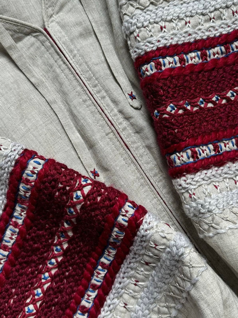Ця сорочка поєднує в собі класичний бежево-сірий відтінок, який створює відчуття спокою та елегантності. Бордова вишивка додає глибини та витонченості, а сині вкраплення візерунків створюють яскравий контраст, що привертає увагу. Вільний крій та натуральна тканина забезпечують комфорт і легкість, а ручна робота надає виробу унікальності та особливого шарму.