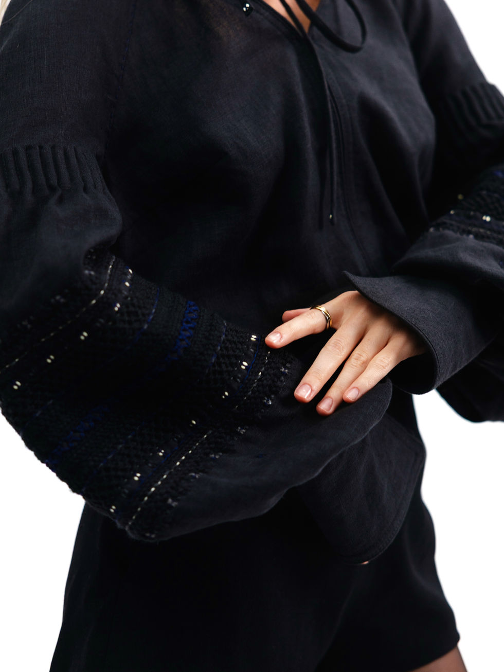 Ця сорочка — втілення сучасної елегантності з відлунням традицій. Глибокий чорний відтінок натурального льону підкреслює стриману силу образу, а акцент на рукавах — його унікальність. Обʼємні, фактурні рукави прикрашені ручною вишивкою в темній палітрі з делікатними вкрапленнями синього та блискітливого чорного — мов зорі на нічному небі.